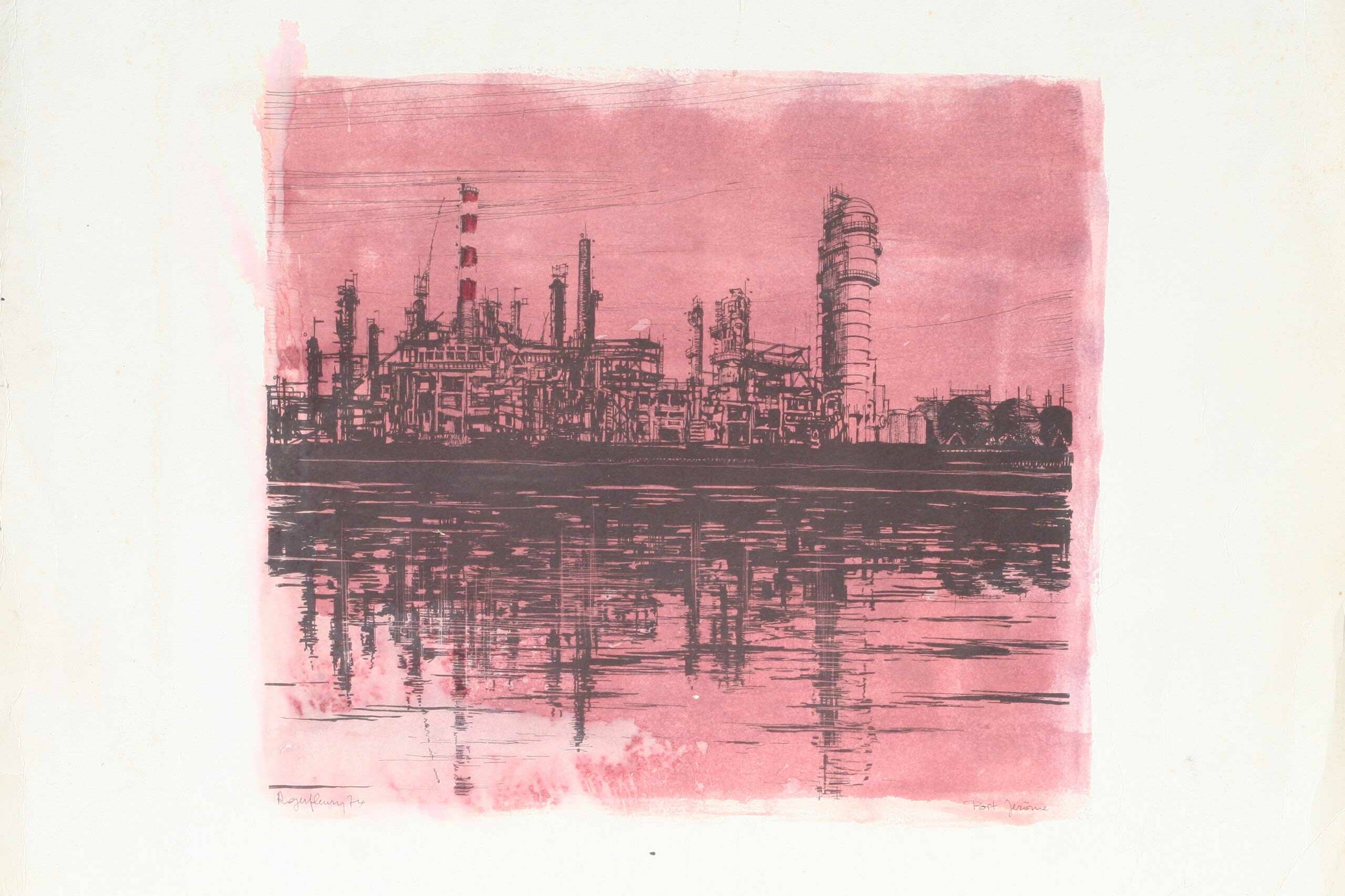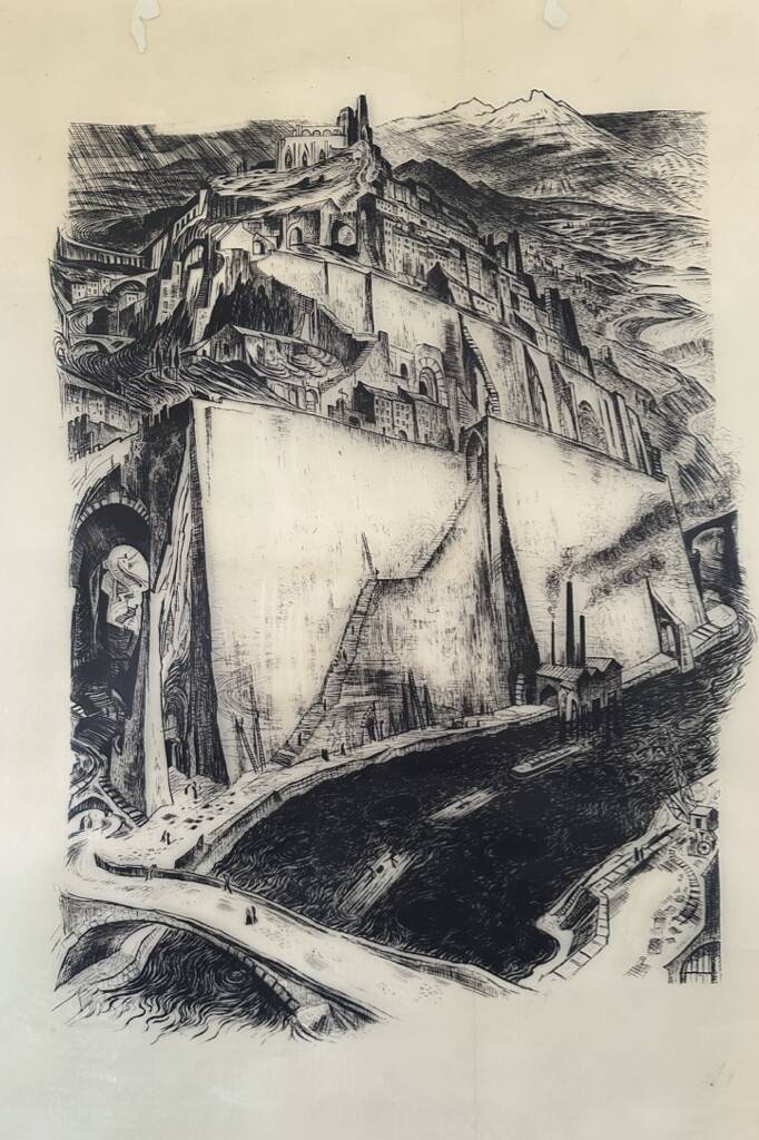 A cet égard, la gravure sur calque « Massif troglodytique » illustre sa qualité d’Artiste et de Technicien versatile. Il s’agit de la gravure détaillée d’un paysage montagneux où alternent dans la fabrique de la roche, figurations architecturales et éléments à caractère industriel, usines, grues, etc, donnant un rendu surréaliste à la scène.